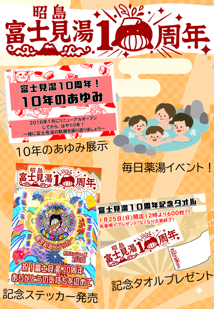 2026.01.16 富士見湯10周年祭ウィーク 1/20㈫から25(日)で開催する富士見湯10周年祭についてのご案内がでました。 ぜひチェックしてみてください。 スタッフ一同みなさまのお越しをお待ちしております🐣♨ 富士見湯10周年祭ウィーク Post Share Hatena Pocket RSS feedly Pin it 富士見湯はリニューアルオープンから10周年を迎えます